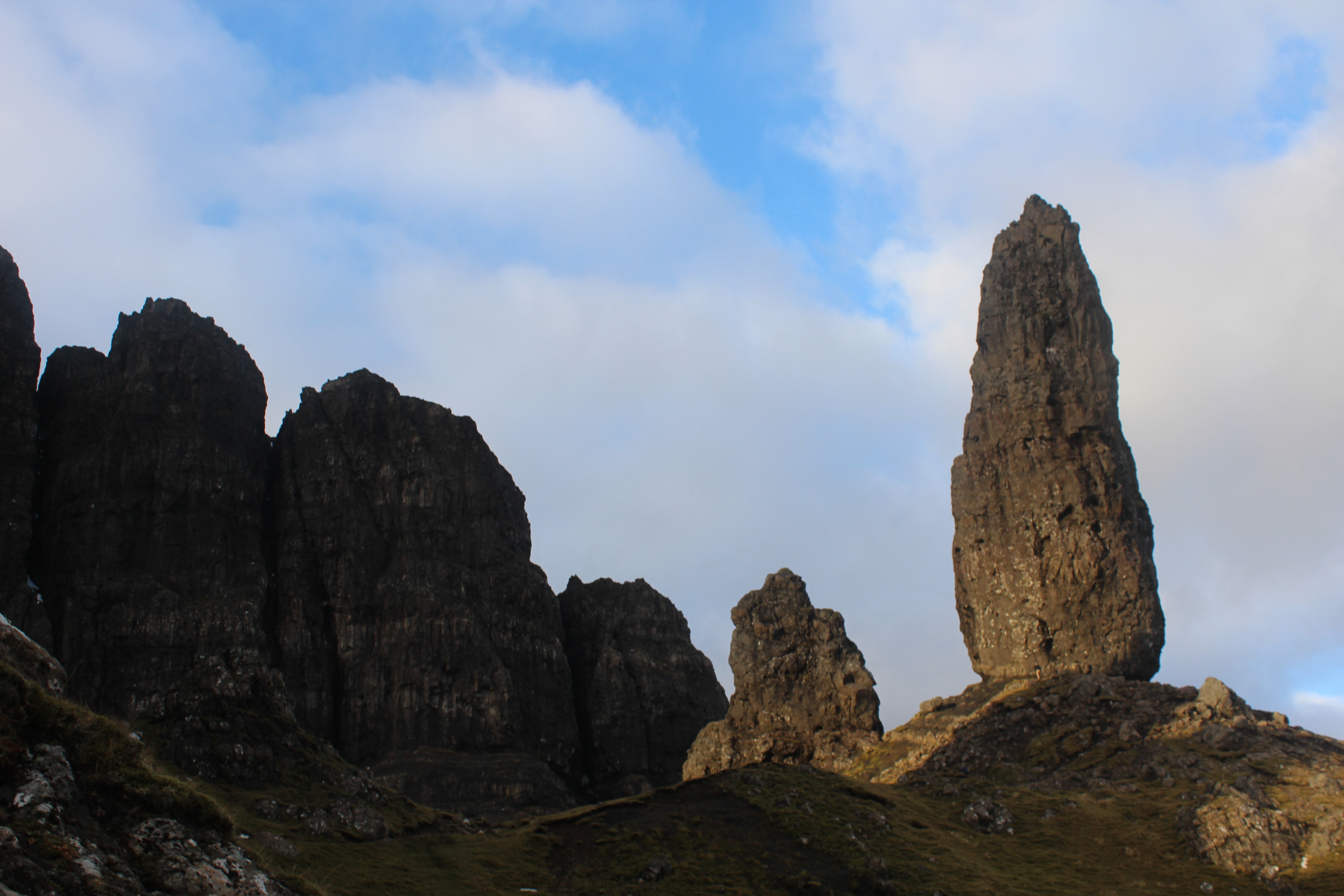 Bob was keen to take me up to see the Old Man of Storr, a 46 metre high (apparently 11 double-decker buses on top of each other, if that helps) pinnacle of rock which formed from glaciers during the Ice Age. It sits below the high cliffs of The Storr, the highest point in the Trotternish Range. It’s about 530 metres above sea level and when I asked Bob what walking up to it could be likened to that I’ve already done, he said it was like walking back up from the Mull of Kintyre lighthouse. On hearing that and remembering that I’d managed to get back from the lighthouse (with a lot of help from Irn Bru) I thought we might as well give it a go. At the time I thought Bob had already been up to it, but it turned out that he hadn’t, which made me even more glad that I’d agreed to it. Having looked at the maps of the area we were both expecting to be traipsing up through a forested area for the first section, but this was not to be. There has been a great deal of deforestation in the area, so much so that there are no longer any trees left. So, instead we traipsed up over bits of tree branches and leaves instead! As we got further up it became tougher and I slowed down quite a bit, but I still kept going and we managed to get quite close to it just as the sun was beginning to go down so we had some fantastic light on this amazing rock with the dark cliffs in the background. We finally reached the Old Man and enjoyed the amazing views from all around, just beautiful and we had the rock to ourselves during the time we were up there. Strolling back down at a faster pace, we stopped occasionally to enjoy the views and take some pictures of the Stornoway coastguard helicopter as it flew overhead.