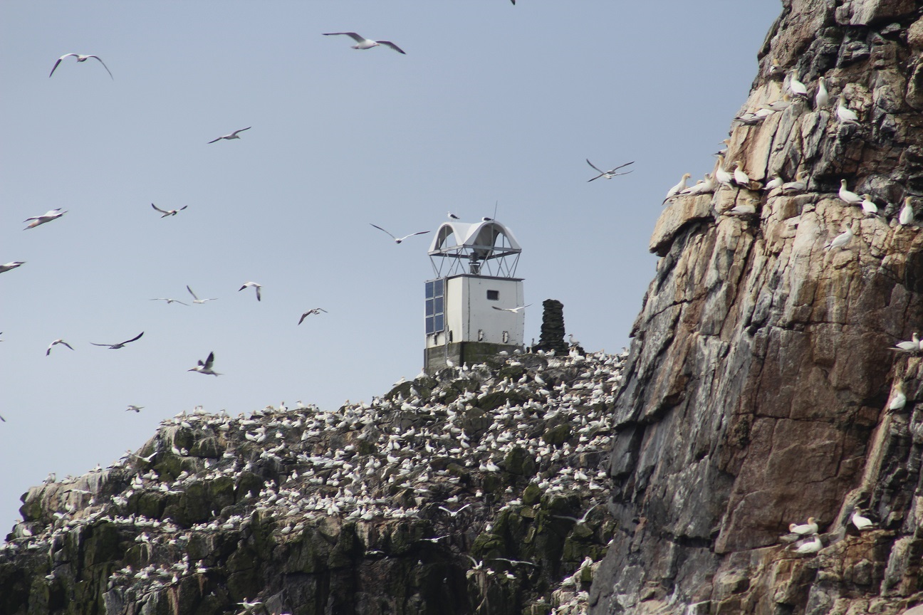 We had a long day lined up for Monday. Bob had arranged, in advance, for us to join a group on the Sea Harris boat from nearby Miovaig. The trip took us on a 3 and a half hour journey to Sula Sgeir. On the trip we saw Aird Laimisiadair on the west coast of Lewis from a distance as well as the Butt of Lewis lighthouse (more on that one to come too) on the very north tip of Lewis. Sula Sgeir has colonies of gannets and fulmar – as well as some puffins – at that time of year. We also got to see the beacon on the island, an interesting building unlike any I’ve seen before. It’s not a big island, but the quantity of birds flying around it or on the land itself would suggest otherwise!