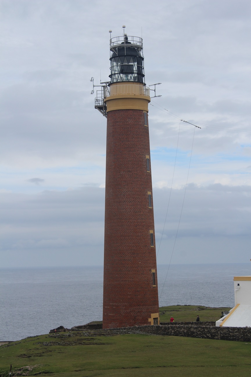Knowing that the Callanish standing stones were a popular attraction on Lewis we decided to pay them a brief visit and return later that day when the tourists were gone. The weather had gone downhill slightly during the day, so we had a quick look around at the stones before heading for our very exciting next stop – the Butt of Lewis. We’d both seen some fantastic pictures and videos of the lighthouse at the Butt of Lewis with massive waves crashing up above the high cliffs there, but there was nothing of that on the day we visited. There is a real sense when you get there that you are at the end of the road and there’s not a lot between the cliffs there and Iceland, although we were surprised to see how close we were to Cape Wrath and, therefore, home! It was great to see another different style of lighthouse, which itself (in my opinion) doesn’t look dissimilar to a chess piece. It’s natural brickwork with no white paint in sight (on the tower anyway) made it stand out from the rest. We enjoyed wandering around the impressive coastline there for a while and seeing the huge cliffs, which seem to dwarf the lighthouse in places. I was surprised at how many people there were walking around, although it did look like there was at least one group of adventurers around and I imagine it might be one of those places where you would choose to start or end some sort of endurance challenge. On our return from the Butt of Lewis we stopped at the Eoropie Tearoom for a drink and I was delighted to see, just along the road that someone had some small handmade stone structures outside of their house, one of which was a lighthouse with an operational light – I’m very easily influenced by these things!