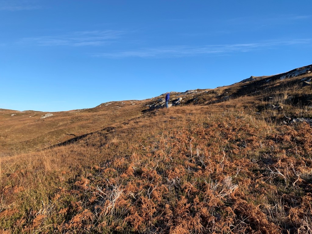 Once past the loch it’s a matter of heading in the right direction which takes you up and down, left and right as you avoid boggy sections and steep slopes. Thankfully much of the vegetation has died back which made it a lot easier to navigate.
