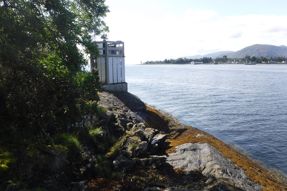 Once we were down on the beach we knew it was plain sailing and a short time later we arrived at the lighthouse. It’s a stunning location with magnificent views up Corran Narrows and over to the hills on the opposite side of Loch Linnhe. The lighthouse is quite a standard flat-pack style, but (like the Corran Narrows North East light) with the solar panels mounted on one side of the structure rather than separate. The lighting arrangements are particularly interesting with an All Round Light for the benefit of vessels heading north and three directional lights helping navigation through the narrowest section near the main Corran lighthouse. The tower doesn’t have a NLB plaque on the door as yet, but hopefully it will soon.