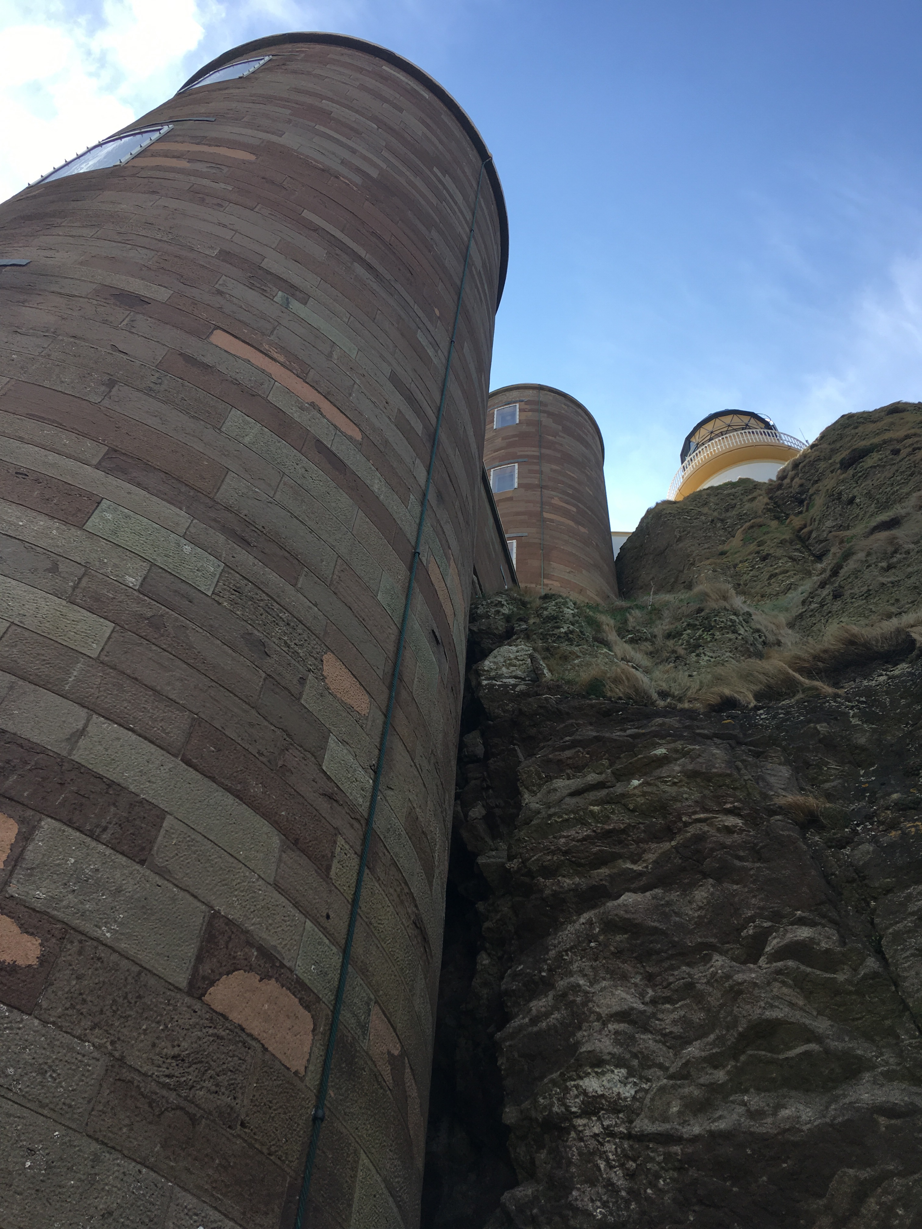 The only real indications of this being a lighthouse are the Northern Lighthouse Board plaque on the door and the modern little light and solar panel on top of the tower. There is a little platform nearby that looked like it may once have accommodated some sort of derrick.