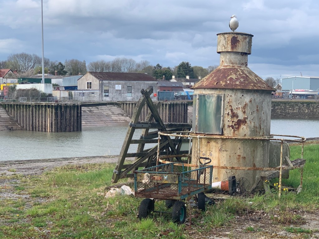 Aware that it would be time to start heading back soon, we decided to leave the two Berkeley Pill lights for next time and instead take a quick look at the old lighthouse lantern at Sharpness Docks. I’ve not managed to get confirmation, but I suspect it was one of the old lanterns from one of the Berkeley Pill lights as the lanterns were changed on these at some point. The old lantern now sits just behind a fence and is looking in a sorry state, especially as the nearby green area is filled with nautical paraphernalia including an old buoy.