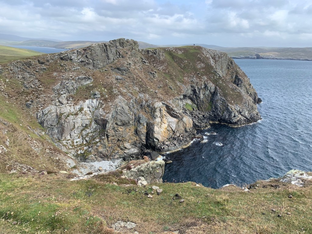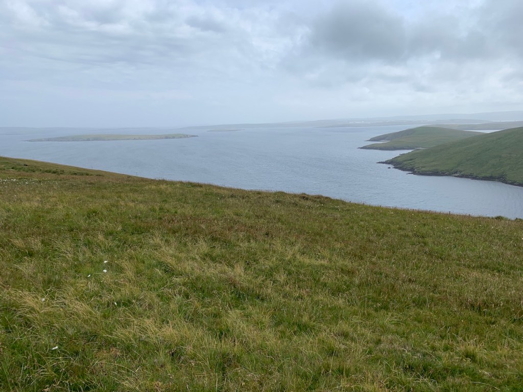 The track then ends at a farm gate and we walked through the field a short way, ending up closer to the coastline. The views looking back towards Walls from here with the yellow flowers in the foreground were excellent.